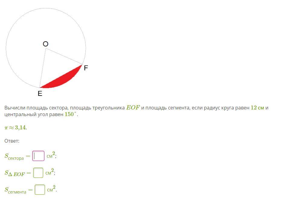 Вычисли площадь сектора, площадь треугольника EOF и площадь сегмента, если радиус круга равен 12 см и центральный угол равен 150°.