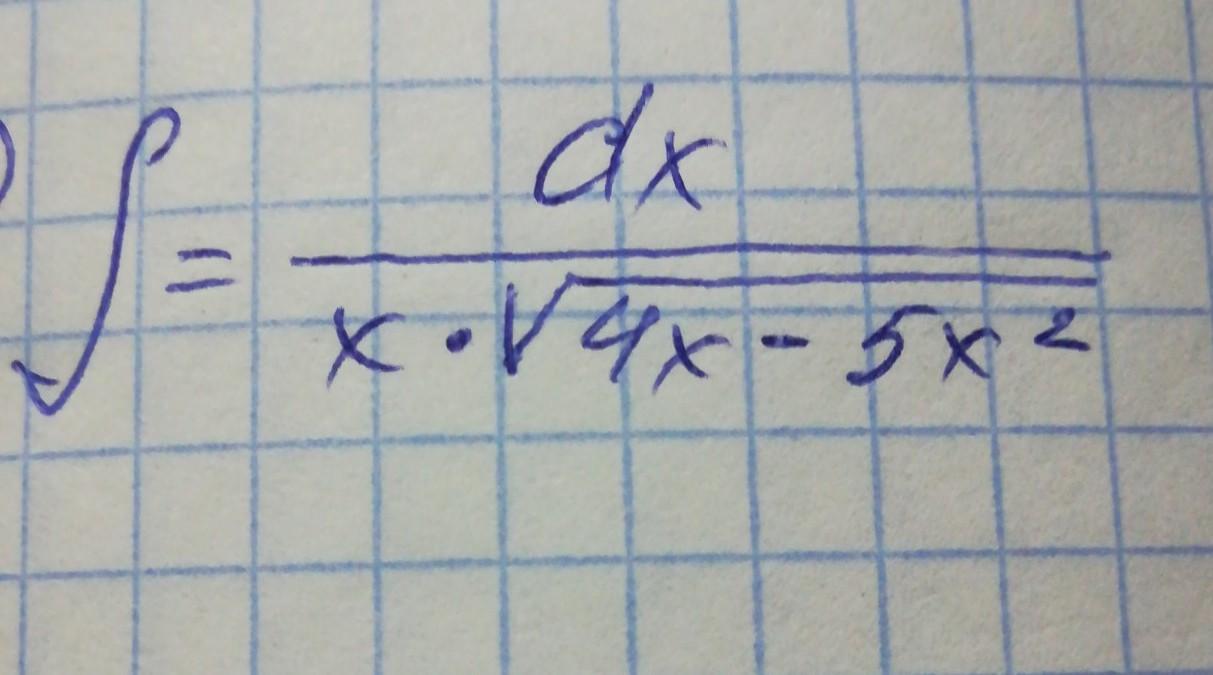 \int \dfrac{dx}{x\sqrt{4x-5x^2}}=\Big[\; x=\dfrac{1}{t}\ ,\ dx=-\dfrac{dt}{t^2}\; \Big]=\int \dfrac{-dt}{t^2\cdot \frac{1}{t}\cdot \sqrt{\frac{4}{t}-\frac{5}{t^2}}}=\\\\\\=-\int \dfrac{dt}{\sqrt{4t-5}}=-2\cdot \dfrac{1}{4}\, \sqrt{4t-5}+C=-\dfrac{1}{2}\cdot \sqrt{\dfrac{4}{x}-5}+C=-\dfrac{1}{2}\cdot \sqrt{\dfrac{4-5x}{x}}+C