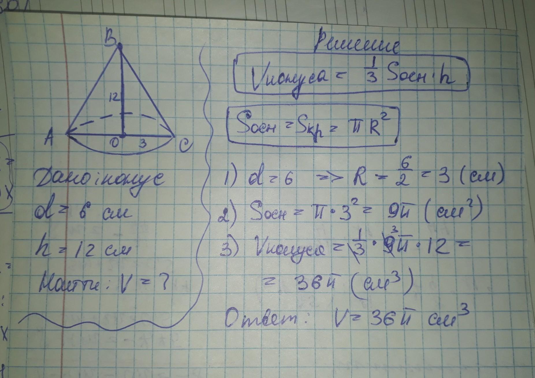 Воронка имеет форму конуса с диаметром основания 6см и высотой 12 см. Найдите объём воронки. Выполните чертёж к решению задачи.