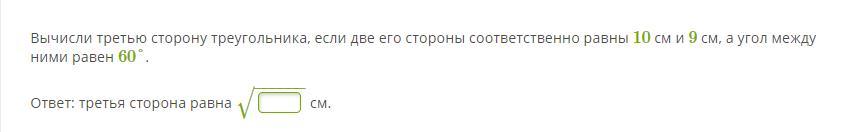 Вычисли третью сторону треугольника, если две его стороны соответственно равны 10 см и 9 см, а угол между ними равен 60°.