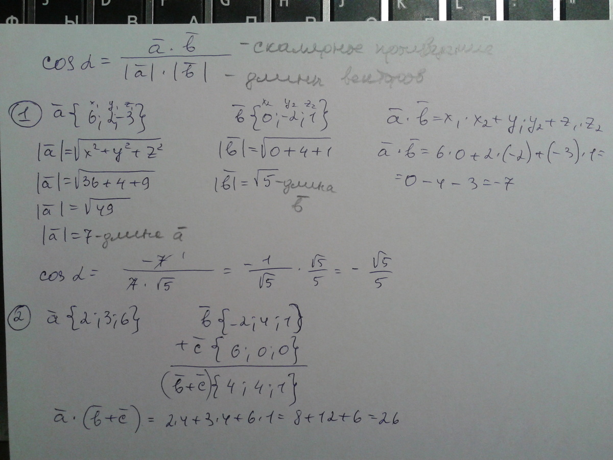 1. Чему равен косинус угла между вектором a{6;2;-3} и вектором b{0;-2;1}.