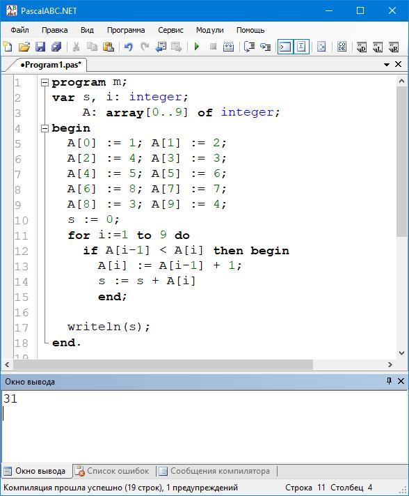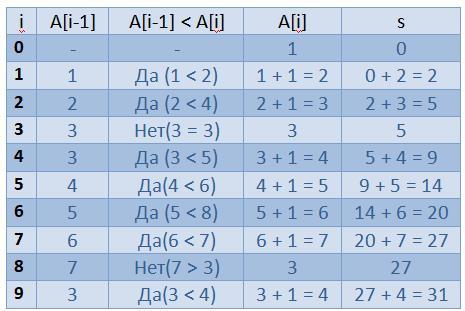 В цикле программы выполняются такие действия: если элемент массива с индексом i меньше предыдущего элемента, то элементу массива с индексом i присваивается значение предыдущего элемента, увеличенное на единицу. А затем это новое значение суммируется со значением переменной s.