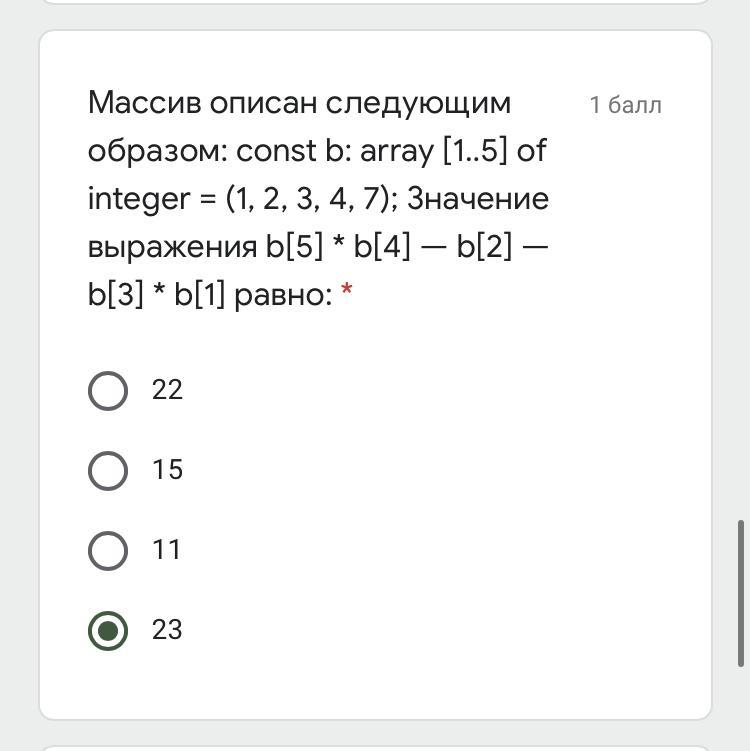 Массив описан следующим образом: const b: array [1..5] of integer = (1, 2, 3, 4, 7); Значение выражения b[5] * b[4] — b[2] — b[3] * b[1] равно: