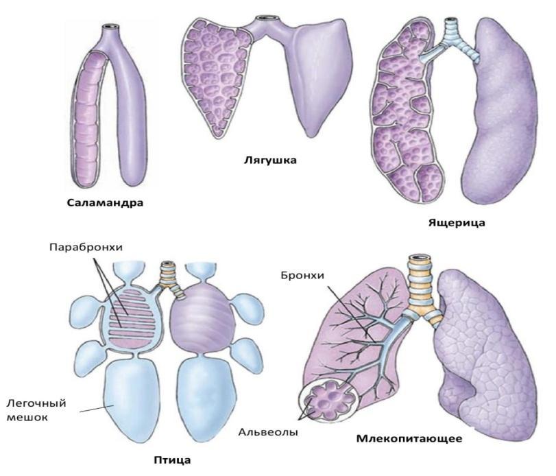 Амфибии - легкие в виде мешочков. Дыхательных путей (трахеи и бронхов)нет