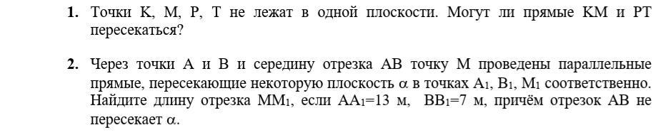 Через две пересекающиеся прямые по следствию из аксиом проходит единственная плоскость, тогда все четыре точки K, M, P, T будут лежать в этой плоскости, что противоречит условию. Следовательно указанные прямые пресекаться не могут.