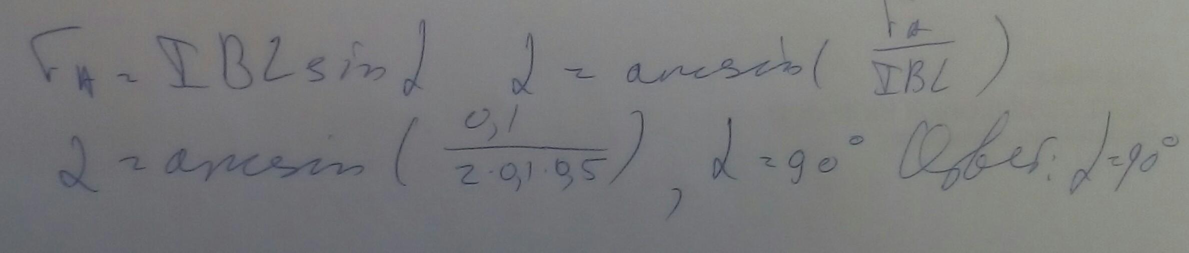 Який кут між напрямом струму і вектором магнітної індукції, якщо на провідник завдовжки 50 см зі струмом 2 А однорідне магнітне поле (В = 0,1 Тл) діє силою 0,1 Н