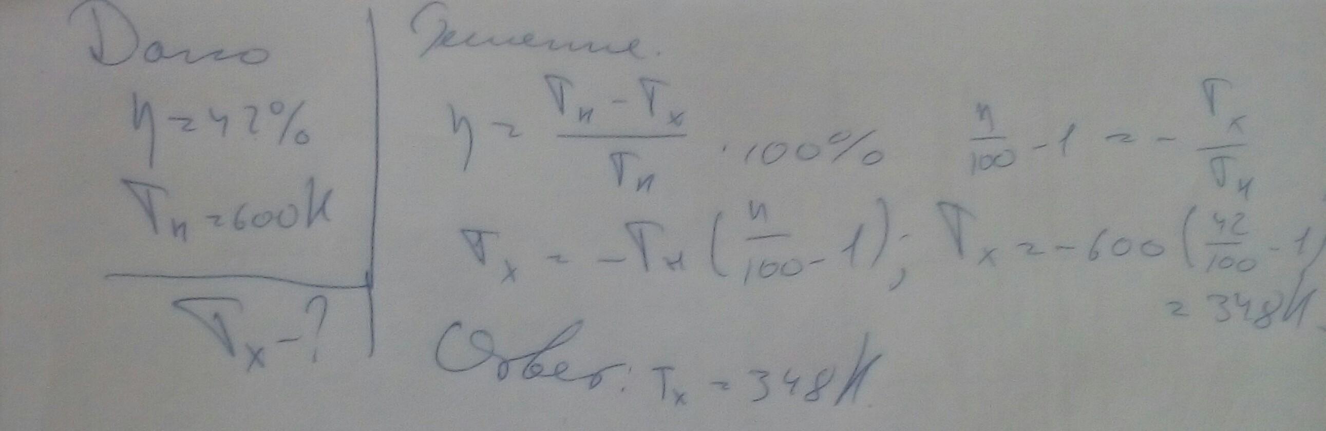 Определите температуру холодильника идеальной тепловой машины, если её КПД равен 42%, а температура нагревателя 600 К.