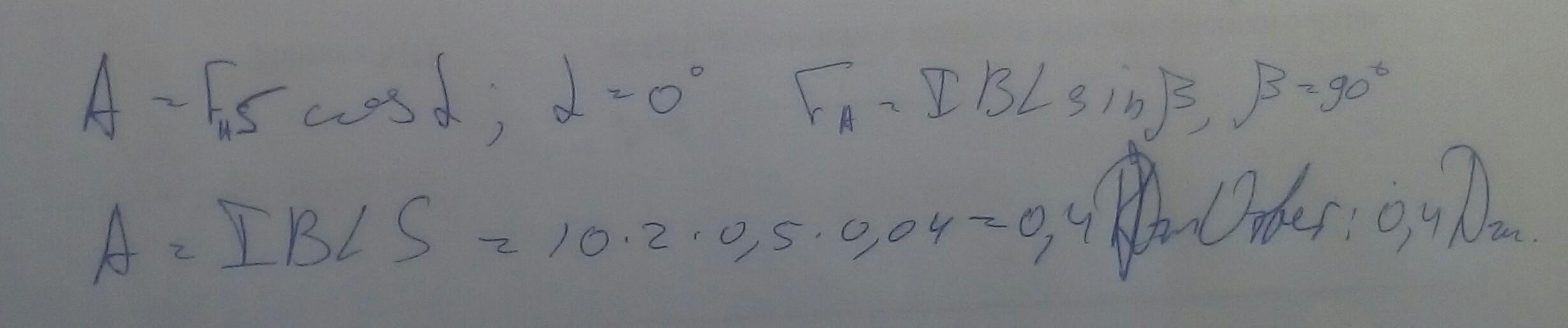 В однорідному магнітному полі з індукцією 2 Тл рухається провідник завдовжки 0,5 м, сила струму в якому 10 А. Обчисліть роботу по переміщенню, якщо провідник перемістився на відстапь 4 см, а напрям силових ліній магнітного поля струму і переміщення взаємно перпендикулярні.