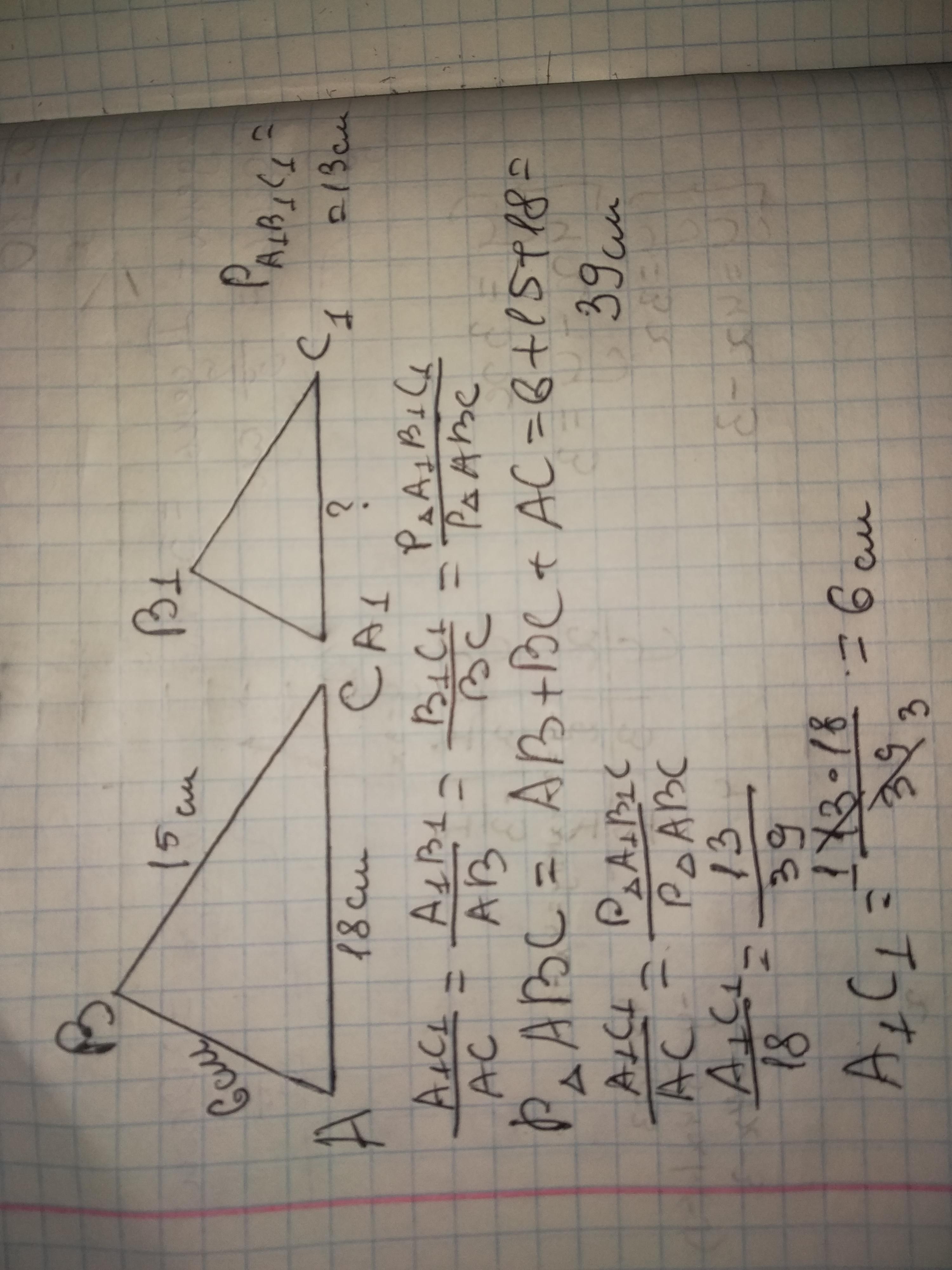 Известно, что Δ~∆A1B1C1, если АВ= 6 см, ВС = 15см, АС = 18 см, Р∆A1B1C1=13см. Найдите длину A1C1.