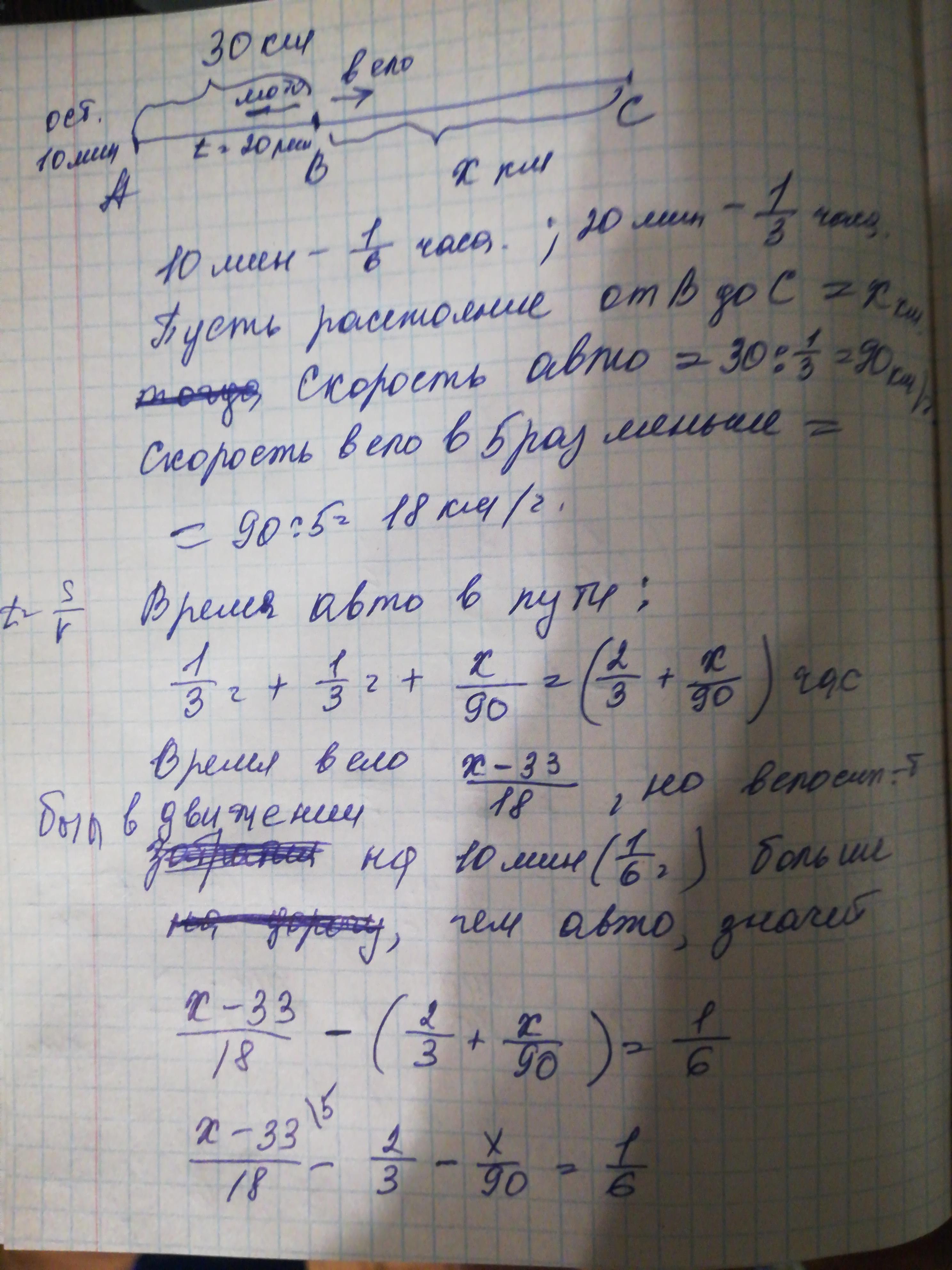 ПУНКТЫ А В С расположены подряд. Расстояние АВ=30 km. Из пункта В одновременно начали движение легковые машина и велосипедист. Легковая м. В сторону А, велосипедист в сторону С. Известно, что велосипедист в 5 раз медленнее машины. Через 20 мин легковые машина прибыла в пункт А и после 10мин отдыха , двинулись в пункт С. Она прибыла в пункт С, когда велосипедисту оставалось ещё 33 км до пункта С.