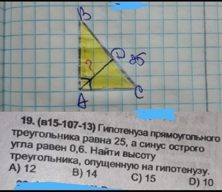 Альтернативное решение абсолютно корректно, я не понял, почему автор задания пишет, что ответ неправильный. На всякий случай пишу другое решение. Для абсолютной прозрачности разделим стороны треугольника на 5. Углы при этом не меняются, мы просто переходим к подобному треугольнику с гипотенузой BC=5 и синусом угла B, равным 3/5. Поскольку синус это отношение катета AC к гипотенузе BC=5, делаем вывод, что AC = 3. Тут уж никаких сомнений не остается, что перед нами в очередной раз - знаменитый египетский треугольник 3-4-5, то есть второй катет AB =4. (Если есть сомнения, примените теорему Пифагора, или воспользуйтесь основным тригонометрическим тождеством "синус в квадрате плюс косинус в квадрате равно 1" (впрочем, это тождество есть непосредственное следствие теоремы Пифагора), найдите косинус угла B (он окажется равным 4/5), после чего AB=4). Высоту можно искать, как в альтернативном решении, из треугольника ABD, но чтобы не дублировать его, воспользуемся всенародно любимым равенством "произведение катетов равно произведению гипотенузы и высоты, опущенной на гипотенузу".