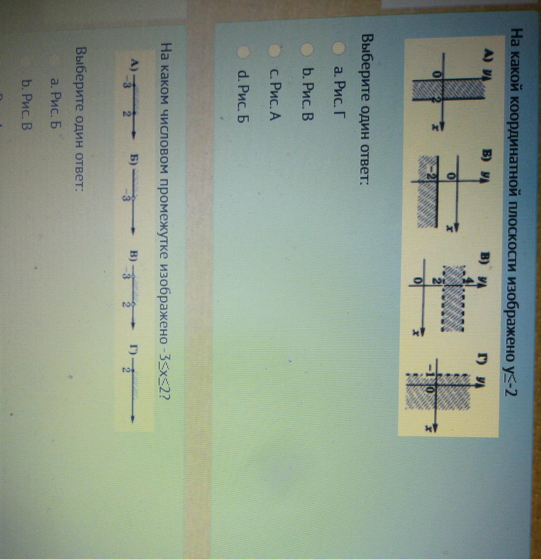 Первый вопрос - ответ Б, штриховка ниже у= -2; Второй вопрос - ответ А, штриховка между -3 и 2, неравенство нестрогое, точки-кружки "закрашенные".