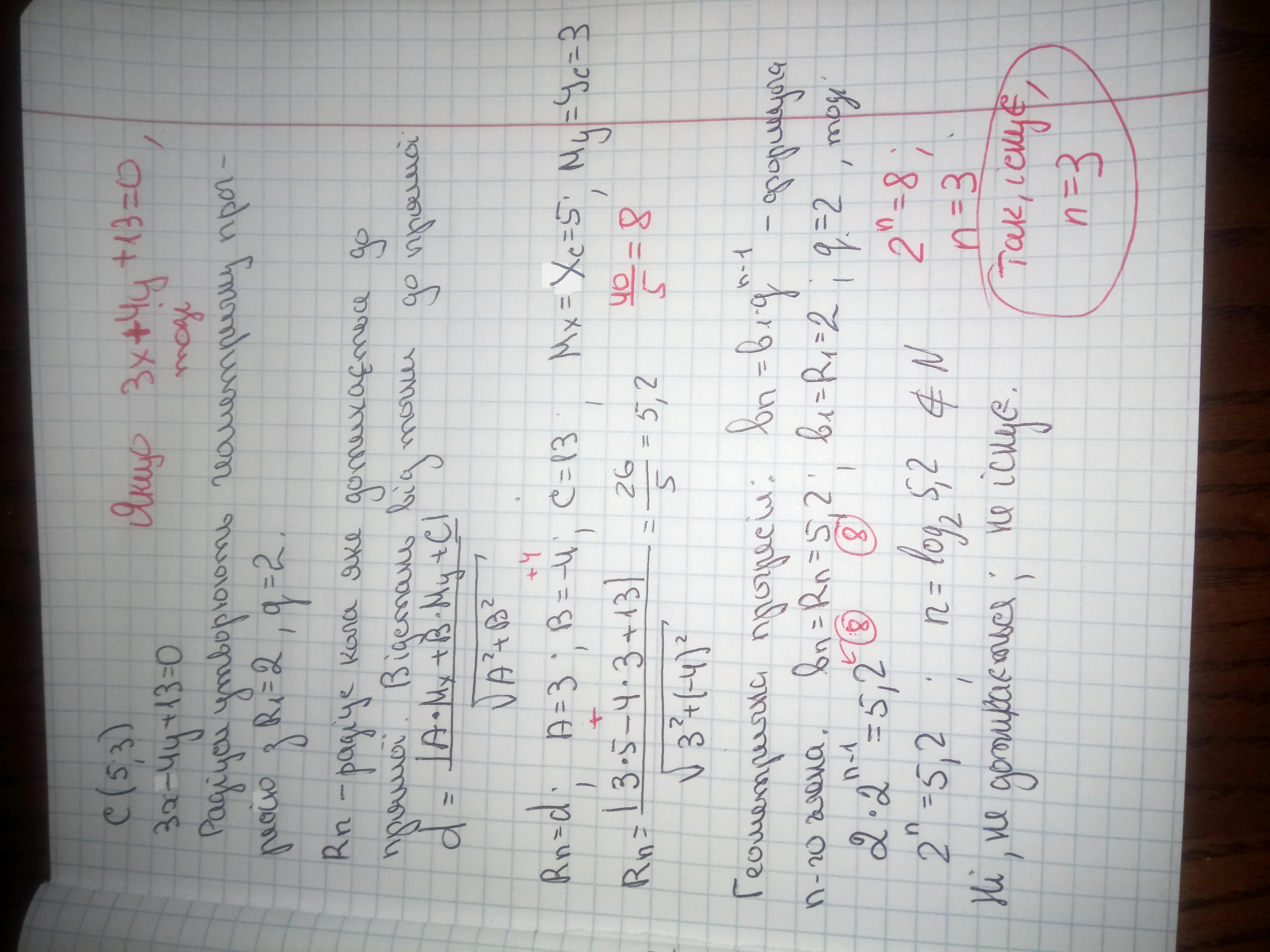 Задана послідовність концентричних кіл з центром в точці C(5; 3) така, що їх радіуси Rn утворюють геометричну прогресію з першим членом і знаменником 2. Чи існує в цій послідовності коло, яке дотикається до прямої 3х-4y+13=0 . Якщо існує, то який його номер?