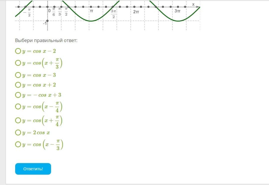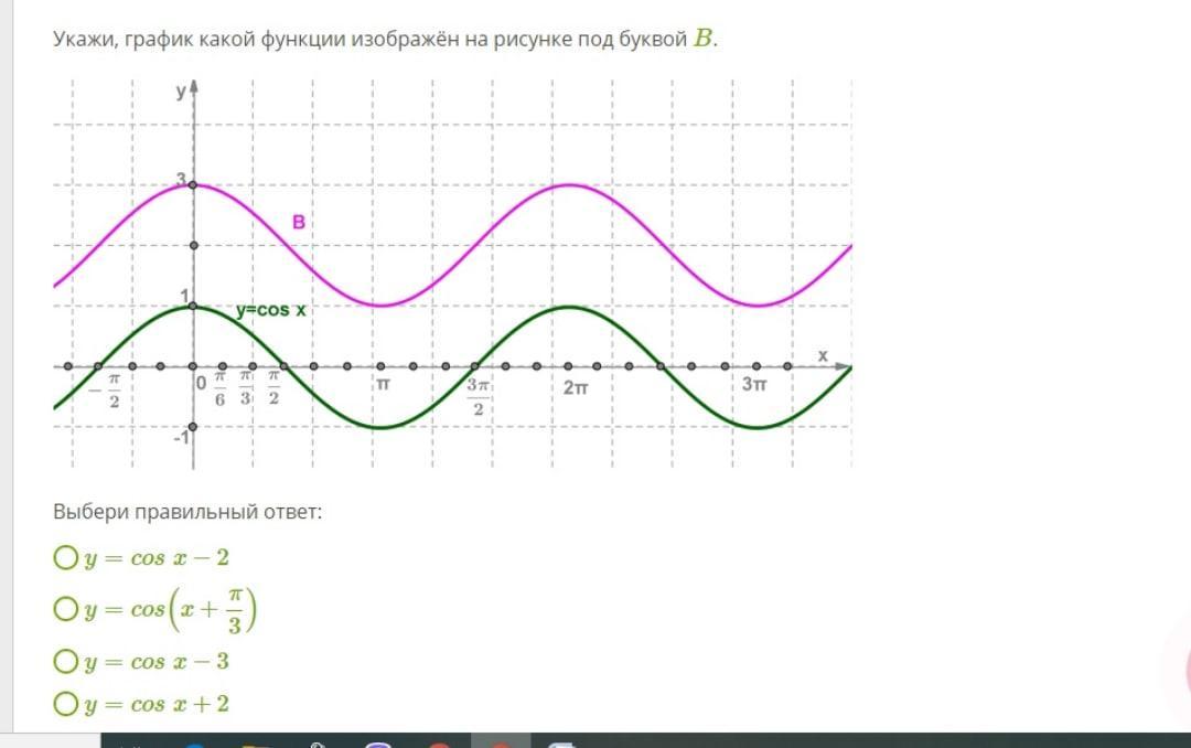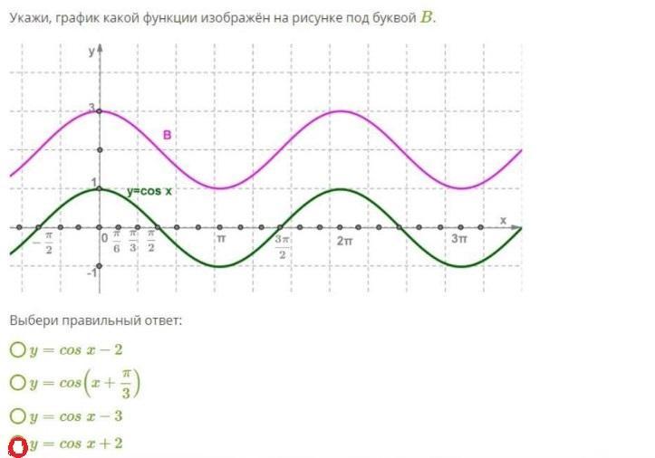 График под буквой В получен из графика у = cos x параллельным переносом вдоль оси ординат (оси Оу) на 2 единичных отрезка, тогда он задан формулой у = cos x + 2.