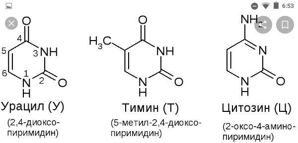 цитозин, тимин, урацил, аденин, гуанин курылымдык жане молекулалык формуласын, атын жазамыз
