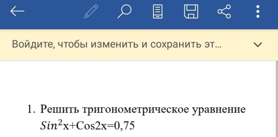 sin^2x+cos2x=0,75\\\\sin^2x+(cos^2x-sin^2x)=\dfrac{3}{4}\\\\cos^2x=\dfrac{3}{4}\ \ ,\ \ \dfrac{1+cos2x}{2}=\dfrac{3}{4}\ \ ,\ \ 1+cos2x=\dfrac{3}{2}\ \ ,\ \ cos2x=\dfrac{1}{2}\ ,\\\\\\2x=\pm \dfrac{\pi}{3}+2\pi n\ ,\ n\in Z\\\\x=\pm \dfrac{\pi}{6}+\pi n\ ,\ n\in Z