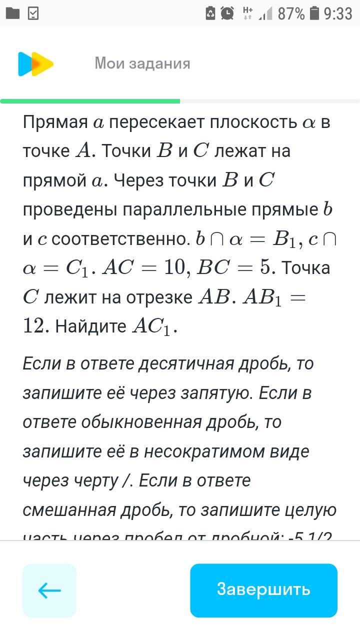 Прямая aa пересекает плоскость \alphaα в точке A.A. Точки BB и CC лежат на прямой a.a. Через точки BB и CCпроведены параллельные прямые bbи cc соответственно. b \cap \alpha=B_1,b∩α=B1, c \cap \alpha = C_1.c∩α=C1. AC=10,AC=10, BC=5.BC=5. Точка CC лежит на отрезке AB.AB. AB_1=12.AB1=12. Найдите AC_1.AC1.