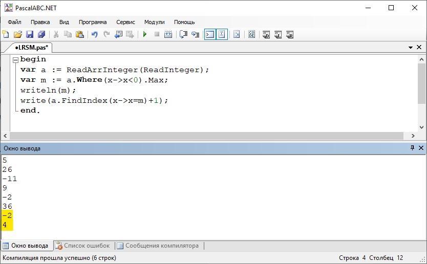 Напишите программу, которая в последовательности целых чисел определяет максимальное отрицательное число и его порядковый номер в этой последовательности. Программа получает на вход количество чисел в последовательности, а затем сами числа. В последовательности всегда имеется отрицательное число. Количество чисел не превышает 1000. Введённые числа принимают значения от -15 000 и не превышают 15 000. Программа должна вывести два числа — максимальное отрицательное число и порядковый номер этого числа в данной последовательности чисел.