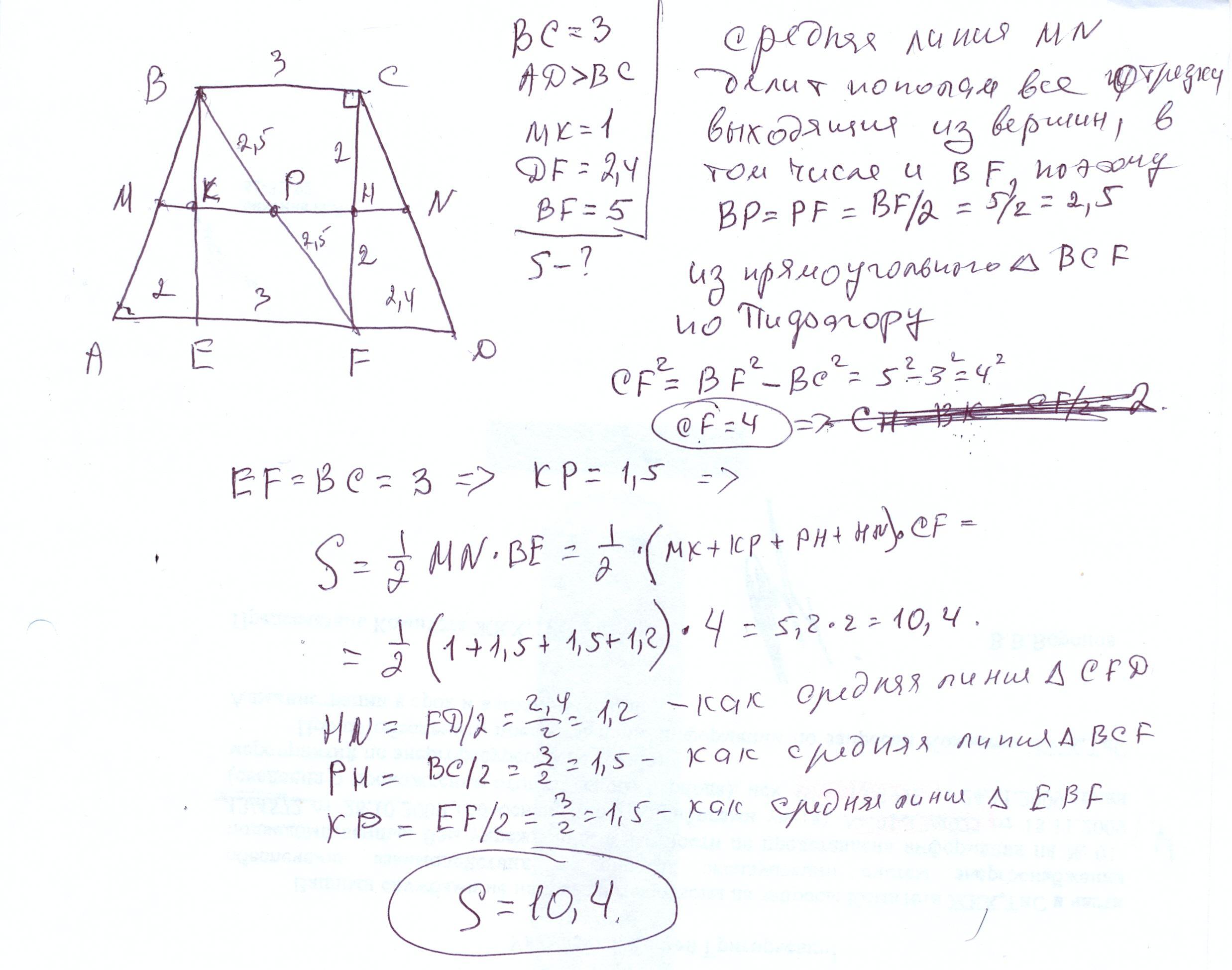В трапеции ABCD с основаниями BC=3 и AD>BC проведены высоты BE и CF. BE пересекает среднюю линию MN в точке K. Известно, что MK=1, DF=2,4, BF=5. Найдите площадь ABCD. Даю 100 баллов.