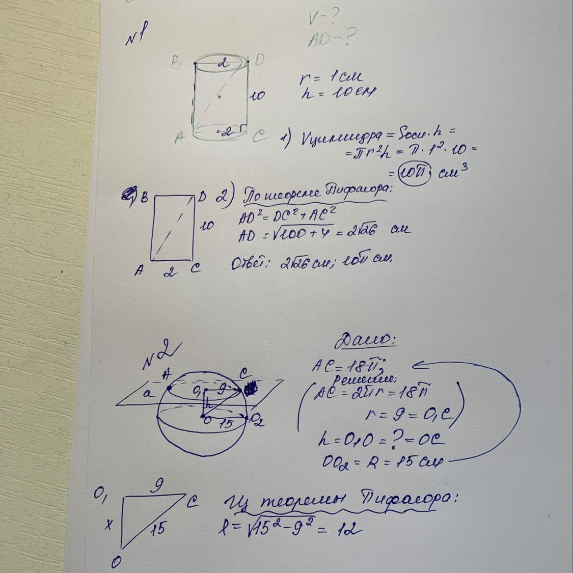 3. Объём находим по формуле,диагональ сечения через прямоугольный треугольник и теорему Пифагора.