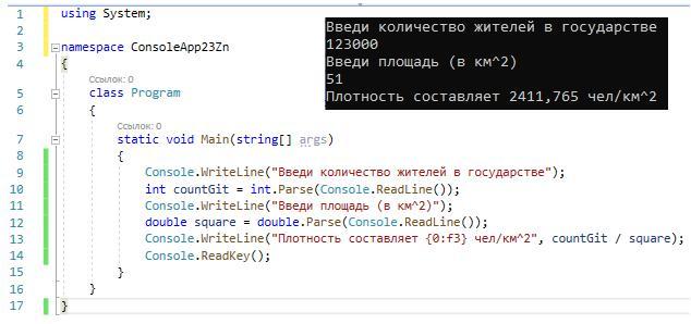 Известны количество жителей в государстве и площадь его территории. Определить плотность населения в этом госу-дарстве.решение в программе c#