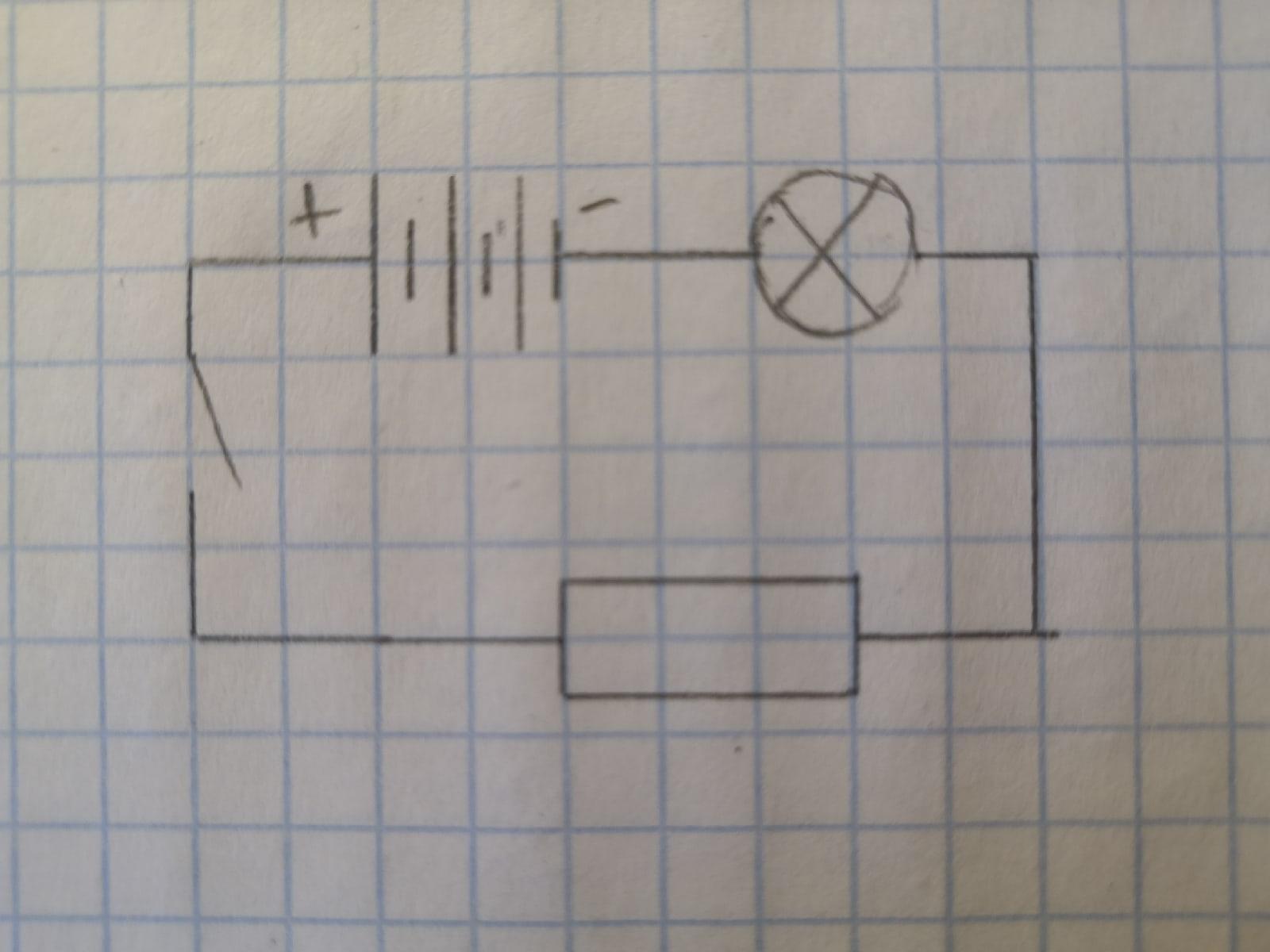 Нарисовать электрическую цепь с источником тока, лампочкой, ключом, резистором.