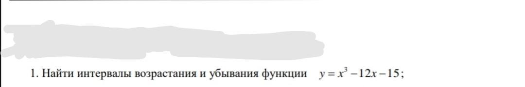 Объяснение:у= х³-12х-15 , область определения функции D(y)=R; ⇒ у'=3x²-12 ⇒ y'=0, если 3x²-12=0 ⇒х²-4=0 ⇒ х=±2- критические точки, которые разбивают область определения функции (всю координатную прямую) на 3 интервала: (-∞;-2], [-2; 2], [2; +∞). Найдём знак производной функции в каждом из этих интервалов: а) на (-∞;-2]⇒ у'=3x²-12= 3·(-3)²-12=27-12=15>0 (знак плюс в этом интервале) б) на [-2; 2] ⇒ у' (0)= 3·0²-12 <0 (знак минус),