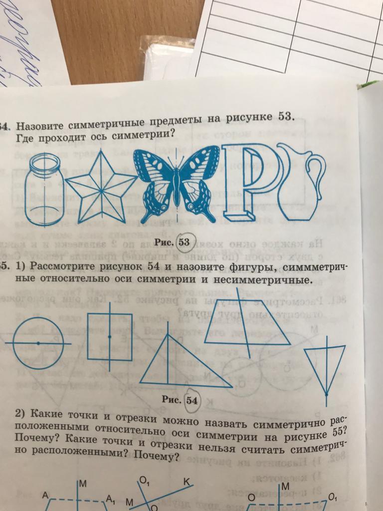 Вопрос: Какие фигуры изображеные на рисунках, симметричны относительно оси симметрии.