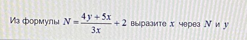 N=\frac{4y+5x}{3x} +2\\\frac{4y+5x}{3x}=N-2\\\frac{4y}{3x} +\frac{5x}{3x}=N-2\\ \frac{4}{3}*\frac{y}{x} +\frac{5}{3}=N-2\\ \frac{4}{3}*\frac{y}{x} +1\frac{2}{3}=N-2\\\frac{4}{3}*\frac{y}{x}=N-3\frac{2}{3} \\\frac{4}{3}*\frac{y}{x}=N-\frac{11}{3} \\\frac{4}{3}*\frac{y}{x}=\frac{3N-11}{3}|*3\\4*\frac{y}{x} =3N-11|:4\\\frac{y}{x}=\frac{3N-11}{4} \\ \frac{x}{y} =\frac{4}{3N-11} \\x=\frac{4y}{3N-11} .