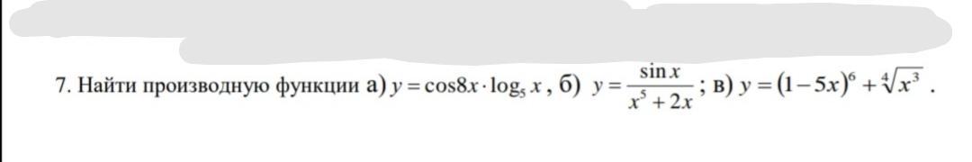 1)\ \ y=cos\, 8x\cdot log_5x\\\\y'=-8\cdot sin8x\cdot log_5x+cos\, 8x\cdot \dfrac{1}{x\cdot ln5}\\\\\\2)\ \ y=\dfrac{sinx}{x^5+2x}\\\\y'=\dfrac{cosx\cdot (x^5+2x)-sinx\cdot (5x^4+2)}{(x^5+2x)^2}=\dfrac{cosx\cdot (x^5+2x)-sinx\cdot (5x^4+2)}{x^2\cdot (x^4+2)^2}