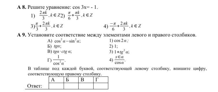 Помогите выбрать правильный вариант ответа по теме «Тригонометрия»