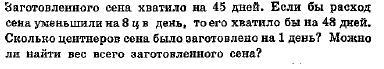 Нехай маса сіна х. Тоді в день витрачається х/45. Після того, як зменшили розхід сіна на 8 ц, розхід став х/45-8. З іншого боку це х/48. Тому прирівняємо два вирази