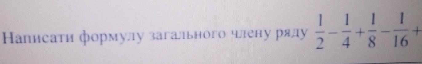 Знак начинает с плюса и поочередно меняется с минусом. Каждый следующий знаменатель является числом 2 в некой степени всегда больше на 1 предыдущего члена ряда. Соответственно формула общего члена ояда —