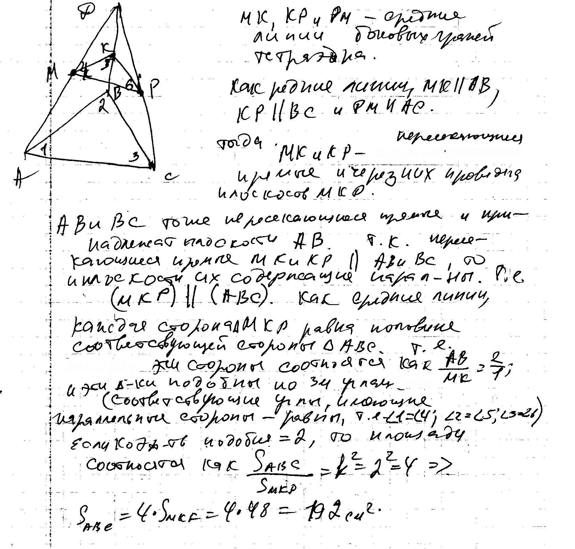 В тетраэдре ABCD точки M ,K и P -середины ребер AD,BD и DC.Докажите что плоскость MKP параллельно плоскости ABC и найдите площадь треугольника ABC если площадь треугольника MKP равна 48см(в квадрате)