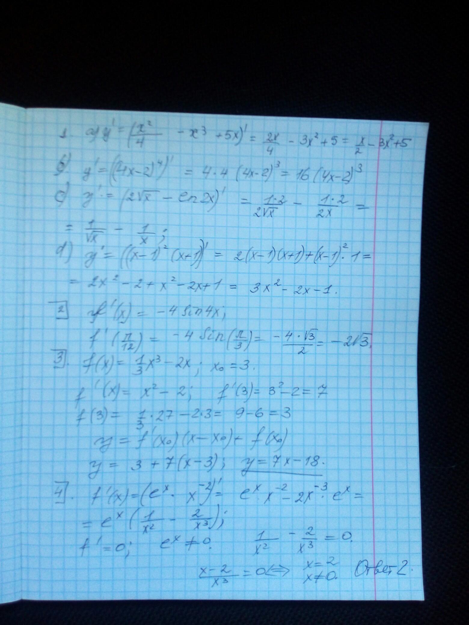 2. Найти угловой коэффициент касательной к графику функции f(x)=cos4x в точке с абсциссой x_0=π/12.