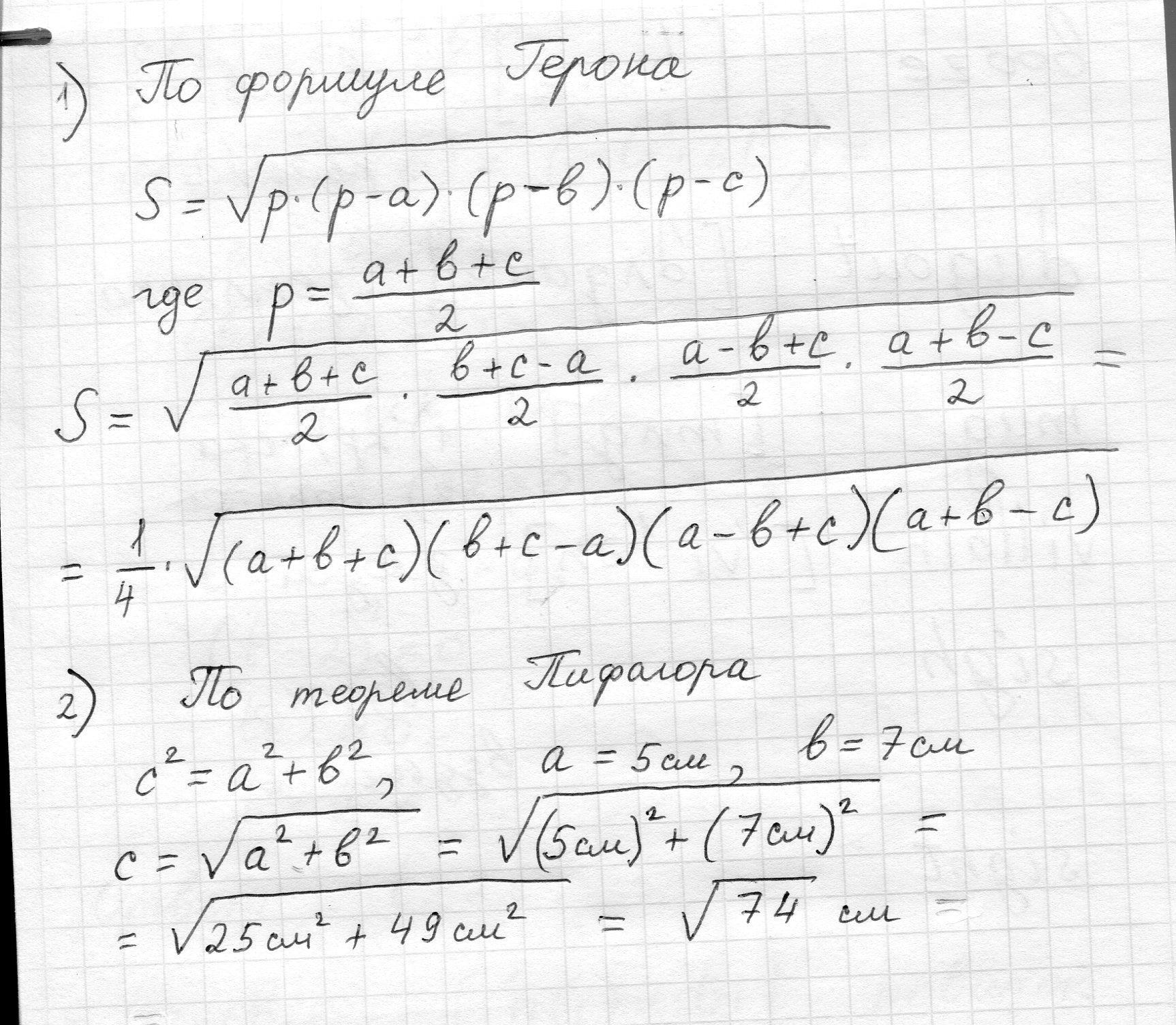 2) Найти гипатинузу прямоуголльного треугольника, если его катеты равны 5 см и 7см .