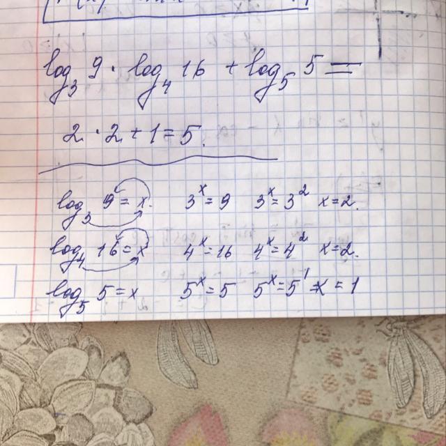 Вычислить log3(маленькая снизу)9(большая) умножить на log4(маленькая снизу)16(большая)+log5(маленькая снизу)5(большая)