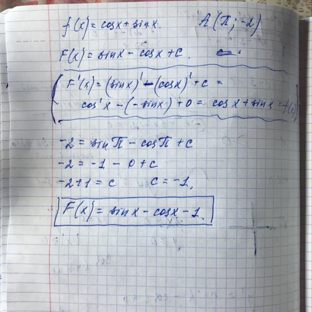 Для функции f(х) найти первообразную. График которой проходит через точку А: f(х)= cosх+ sinх ; А(π; -2)