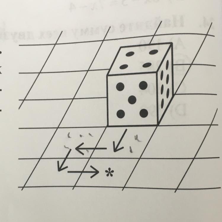 Кубик лежит на листе бумаги в клетку, как показано на рисунке. Кубик перекатывают через рёбра в направлениях, указанных стрелочками. Сколько точек окажется сверху когда кубик попадёт на клетку, отмеченную звёздочкой? Сумма точек на противоположных гранях равна 7.