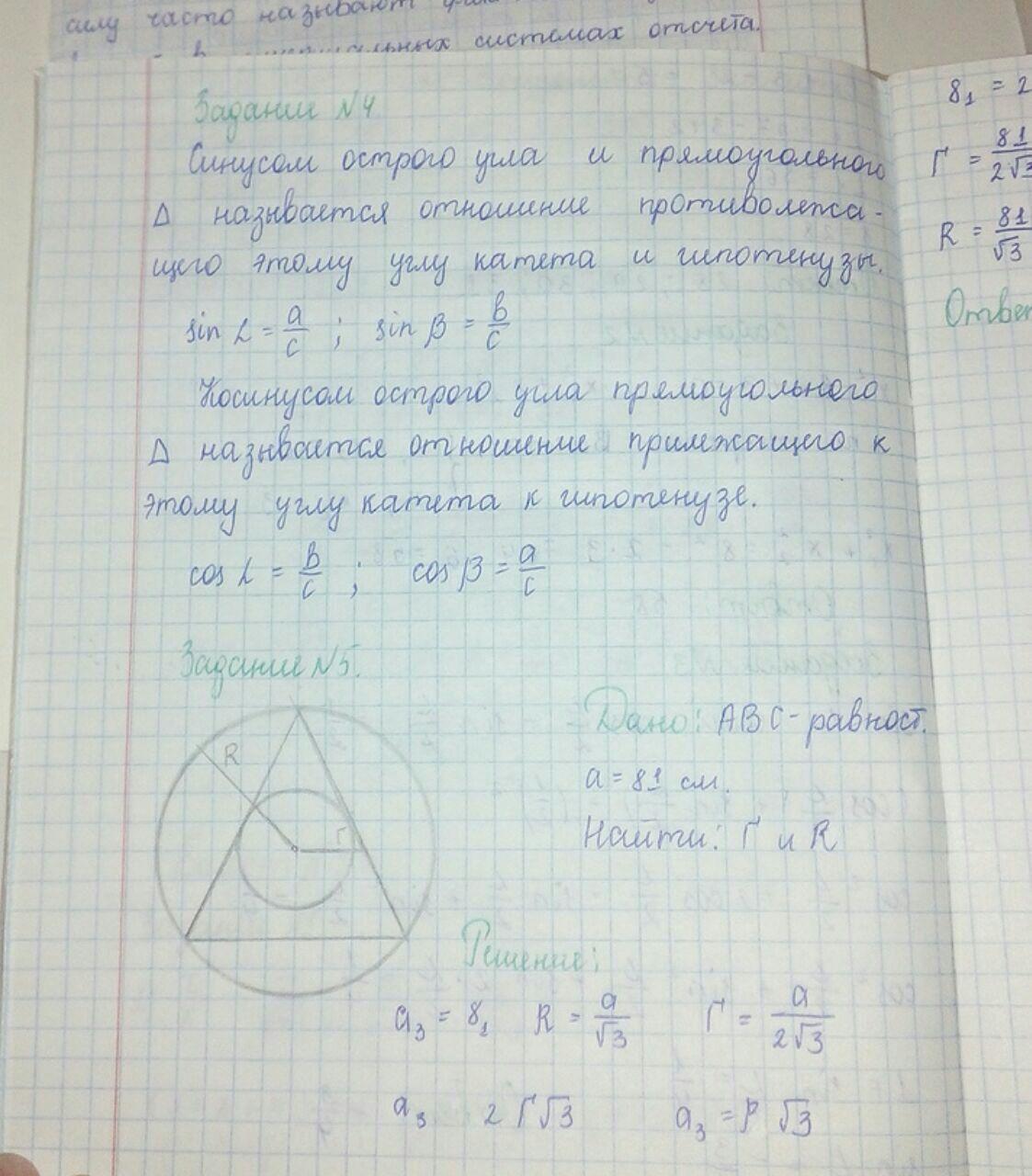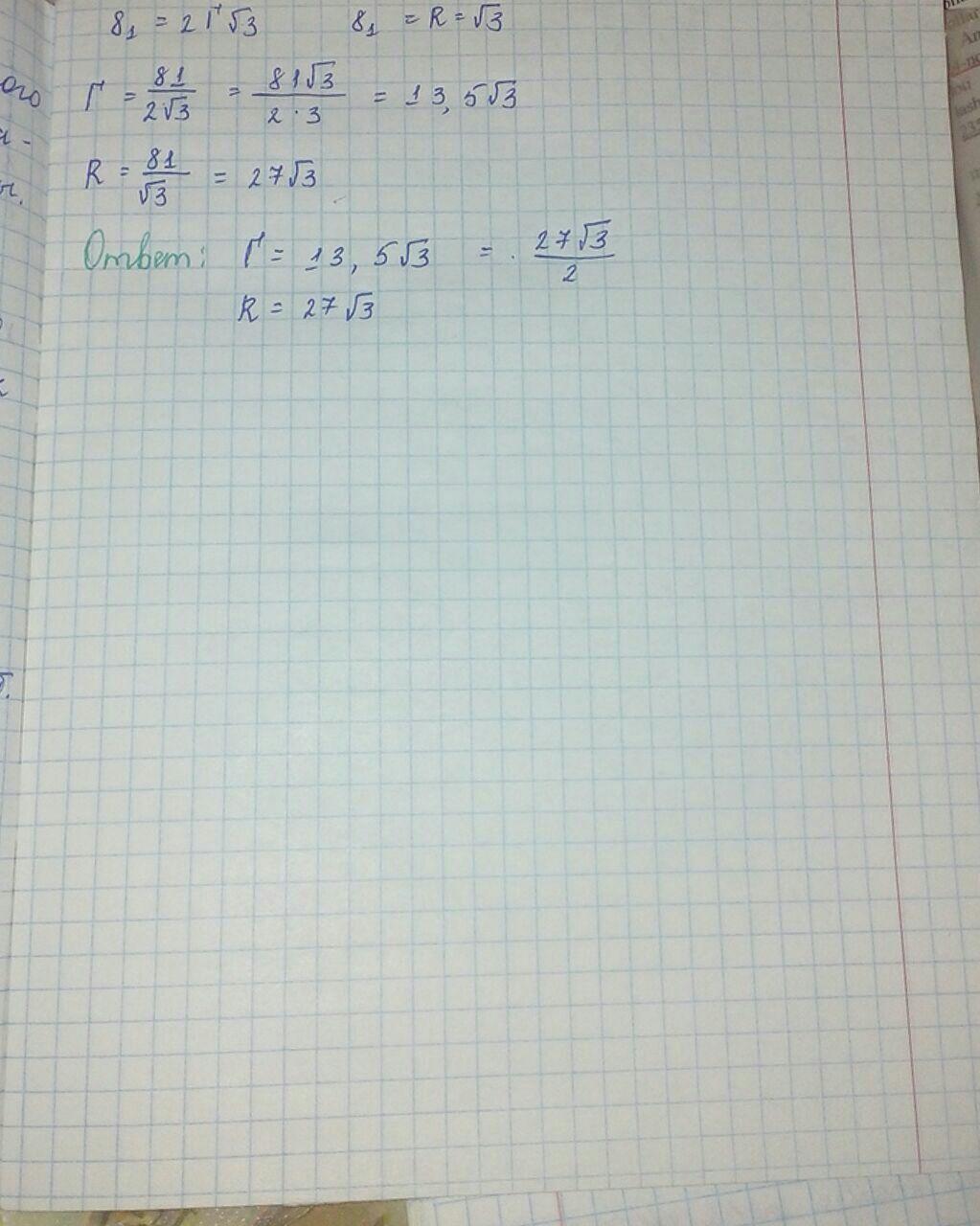 5. Найдите радиусы вписанного в равносторонний треугольник и описанного около него окружности, если его сторона равна 81.