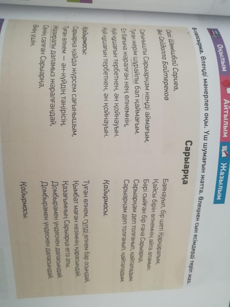 Өлеңдегі сын есімдер: сағынышты, кенді, шұрайлы, кең, жазиралы, жаралғандай, гүлді, қымбат, егіз, даласындай.