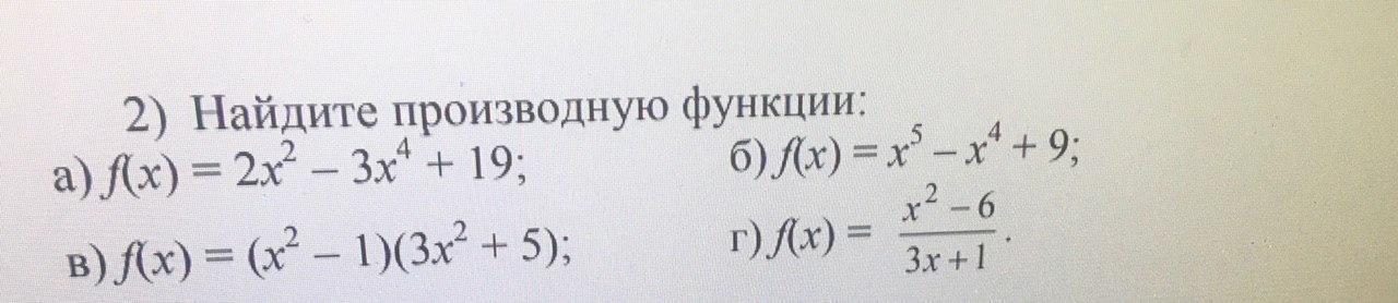 г) (x^2-6/3x+1)"=(x^2-6)"*3x+1-x^2-6*(3x+1)"/(3x+1)^2=2x*3x+1-x^2-6*3/(3x+1)^2=