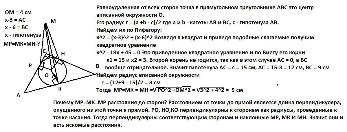 Точка М рівіновіддалена від усіх сторін прямокутного трикутника і знаходиться на відстані 4см від його площини. Знайдіть відстань від точки М до сторін трикутника, якщо його гіпотенуза на 3см і 6см більша від катетів.