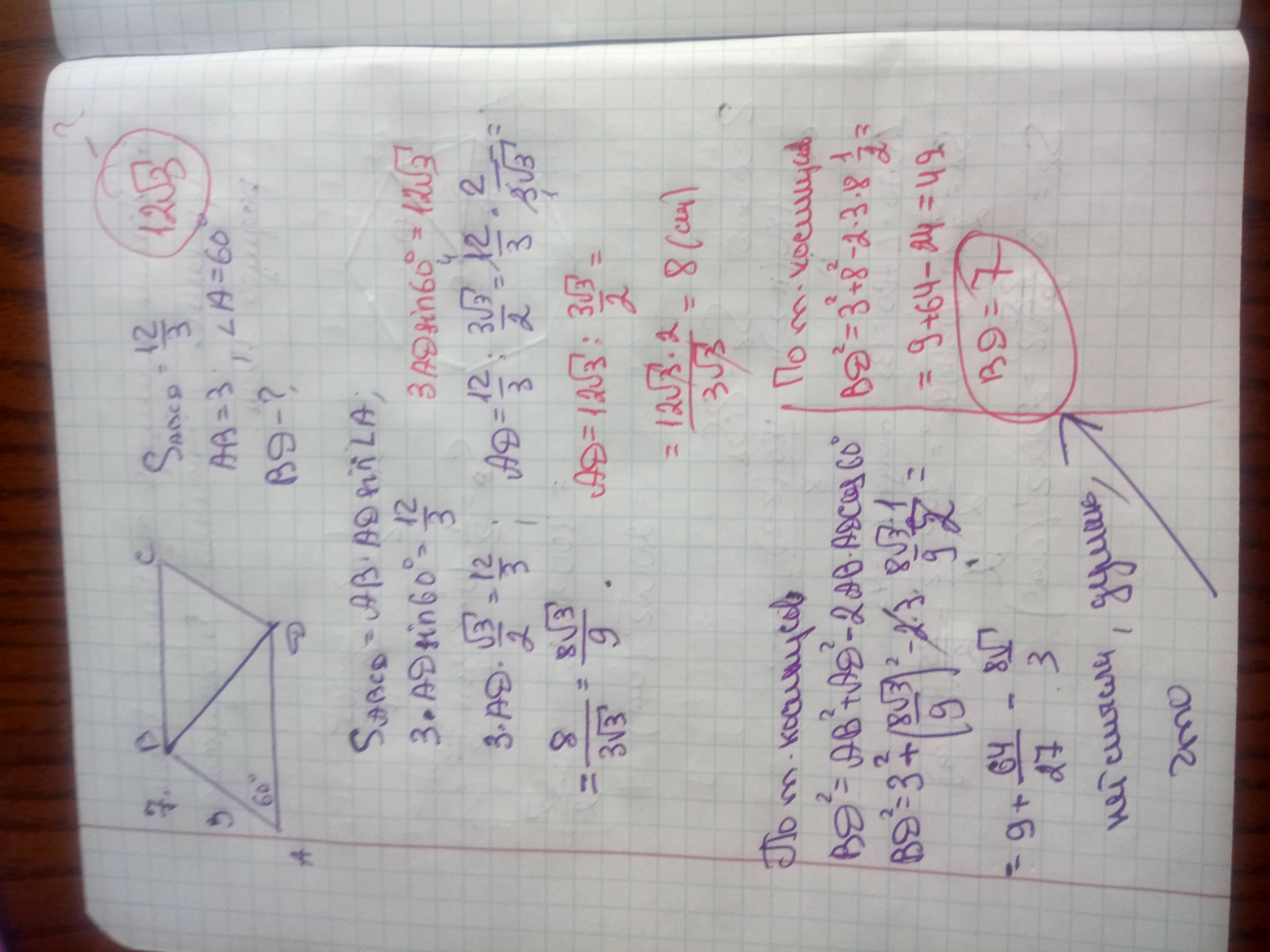 12/3, AB 3, ZA = 60°, Найдите длину диагонали BD.