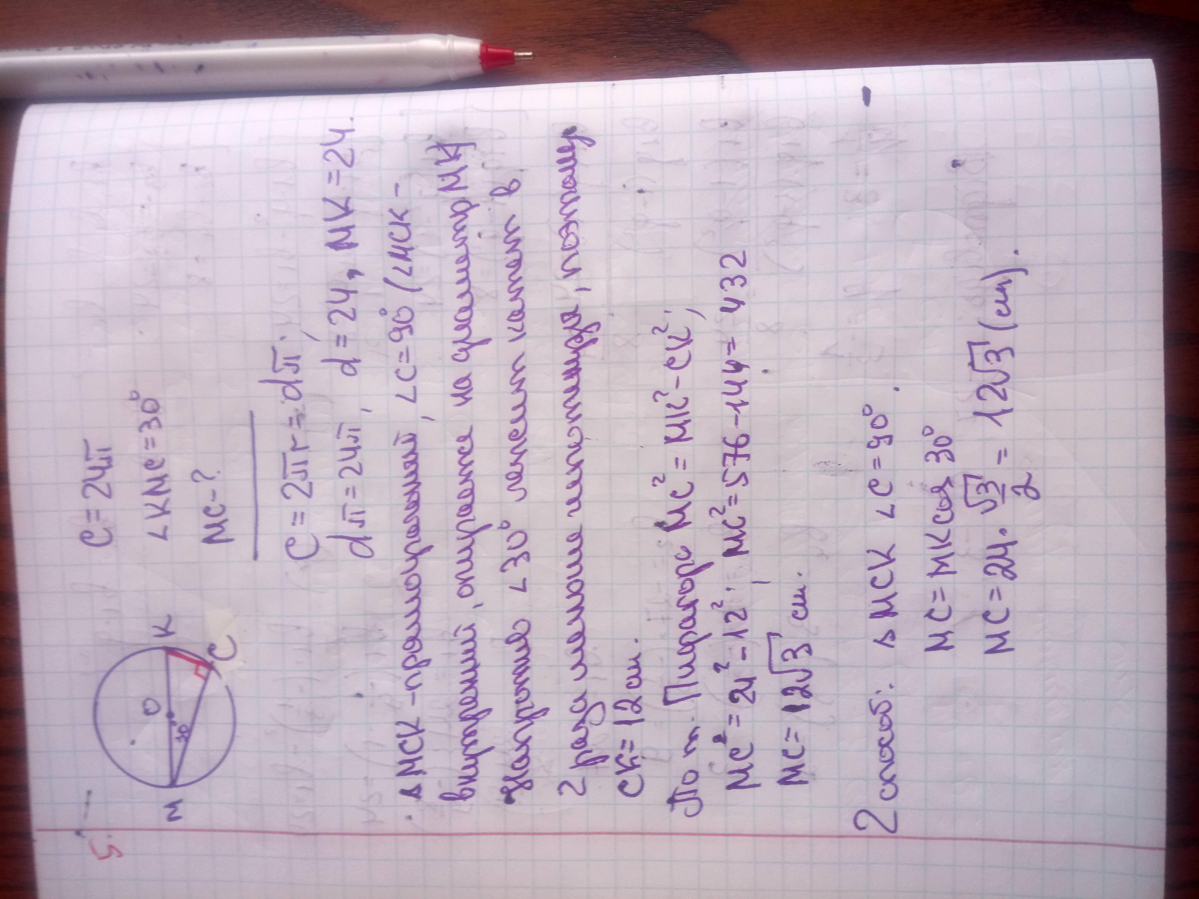 диаметр окружности. Найдите длину хорды МС, если ZM - 30°, а длина окружности равна 24л.