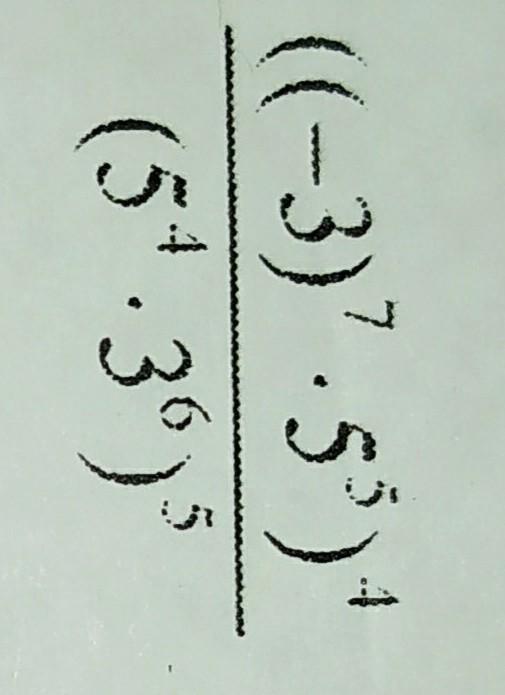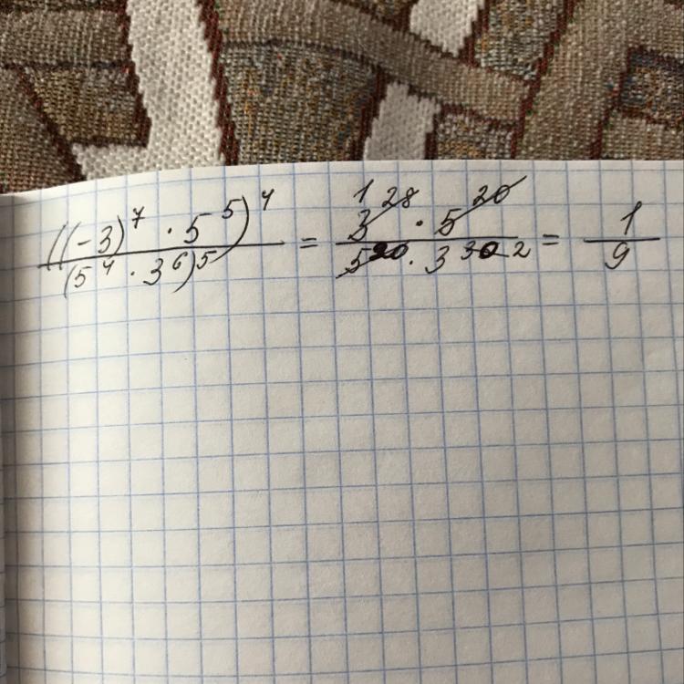 ((-3)^7*5^5)^4/(5^4*3^6)^5=(-(3^7)*5^5)^4/(5^4*3^6)^5=(3^28*5^20)/(5^20*3^30)= 1/3^2=1/9