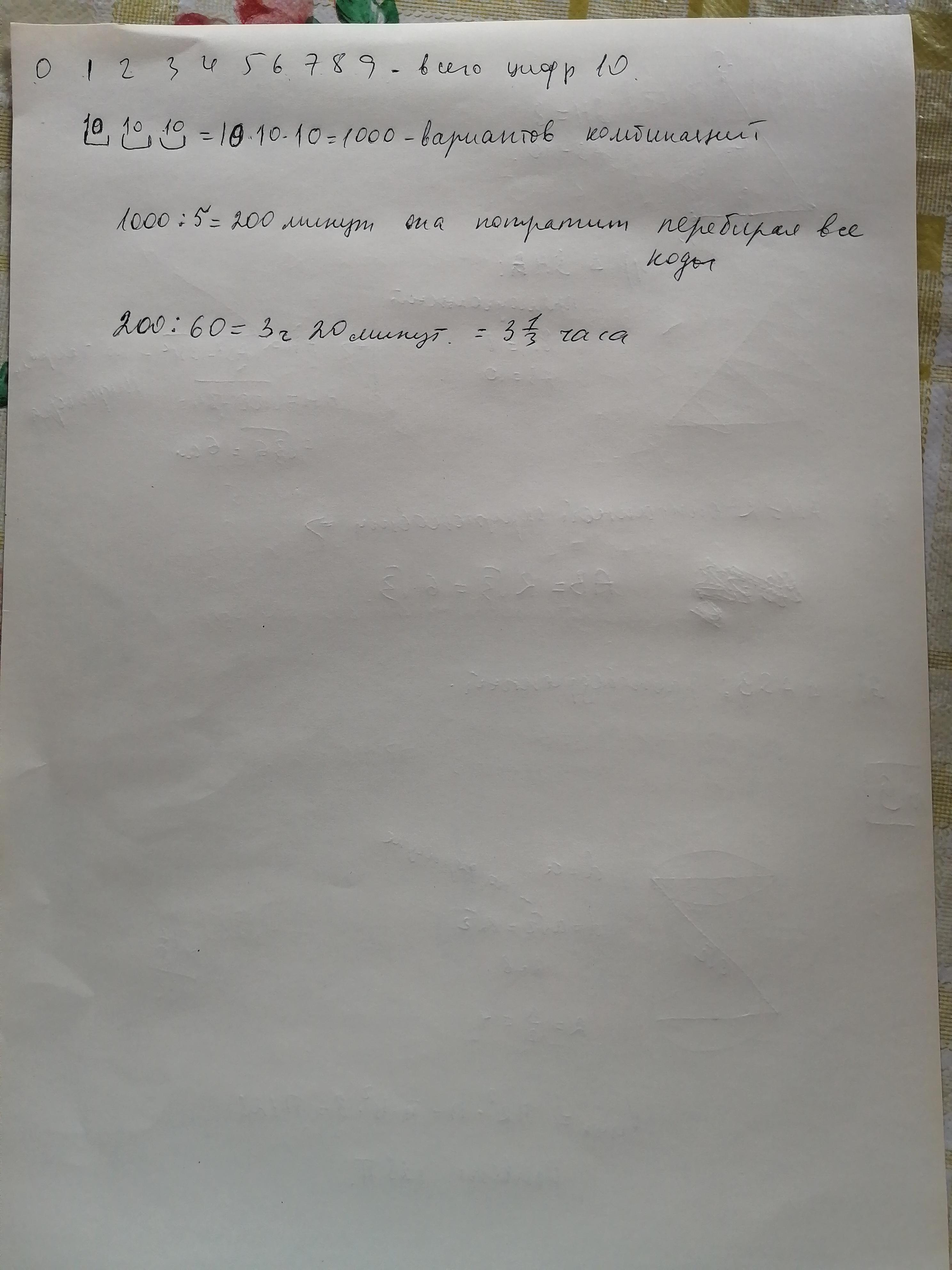 Виктория Михайловна отправилась в путешествие и в гостинице выяснила, что не помнит код от замка на чемодане. Сколько часов пройдет, пока Виктория Михайловна откроет чемодан, если код состоит из трех цифр от 0 до 9, цифры могут повторяться, ВМ перебирает варианты со скоростью 5 кодов за минуту, и ей сегодня катастрофически не везет?