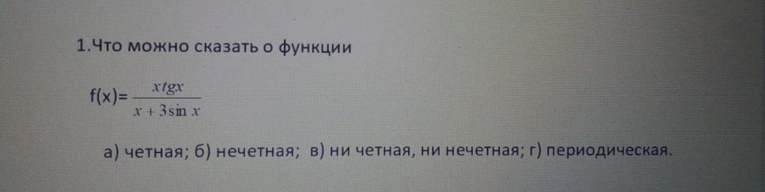 f(-x) = (-x * tg(-x)) / (-x + 3 sin(-x)) = (-x * (-tgx)) / (-x - 3sinx) = x * tgx / -(x + sinx) = -f(x) => функция нечётная, потому что f(-x) = -f(x)