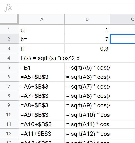 Составить программу вычисления значений функции F(x) на отрезке [а; b] с шагом h. Результат представить в виде таблицы, первый столбец которой- значение аргумента, второй- соответствующие значения функции: F(x)= sqrt (x) *cos^2 x