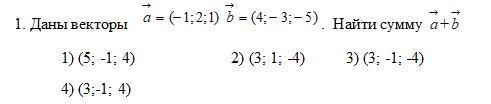 Даны векторы a = (-1;2;1) b = (4;-3;-5) Найти сумму a+b 1) (5; -1; 4) 2) (3; 1; -4) 3) (3; -1; -4) 4) (3;-1; 4